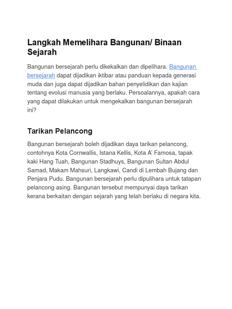 Langkah seterusnya yang wajar diberi perhatian oleh kerajaan adalah dengan memberi peruntukan khas bagi memelihara dan memulihara bangunan bersejarah. Dalam penulisan karangan Bahasa Melayu pelajar pelajar akan dicabar untuk berfikir secara kreatif. Malaysia pernah dijajah selama 446 tahun dan akhirnya mencapai.