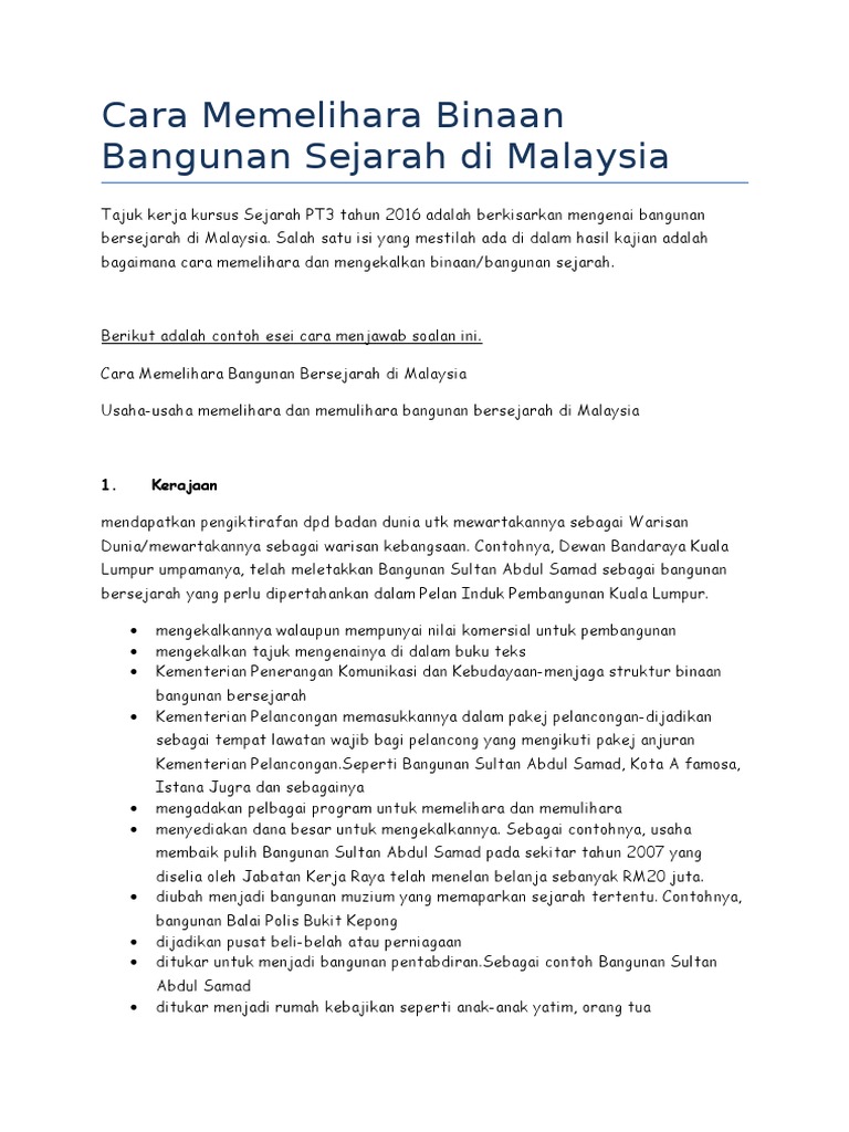 Langkah Memelihara Bangunan Bersejarah Dan Cara Memulihara Binaan. Pembangunan di negara kita semakin hari semakin maju dan pesat seiring dengan nama Malaysia yang kini lebih dikenali sebagai negara yang sedang membangun. Semoga perkongsian bahan-bahan rujukan panduan bahan pembelajaran dan pengajaran contoh-contoh karangan sumber rujukan SPM Sijil Pelajaran Malaysia tingkatan 4 tingkatan 5 dalam post di blog Bumi Gemilang berguna dan dapat.